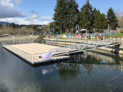 - Upon completion of the week-long hockey event, the docks were uninstalled, moved, and re-installed as boat launches and floating docks anchored on piles.